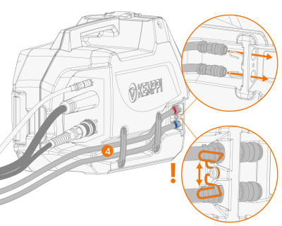 | 4. | 如果有选配的水冷单元,则将冷却液软管 (4) 放入送丝机一侧的凹槽中,连接器穿过开孔。 |