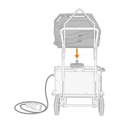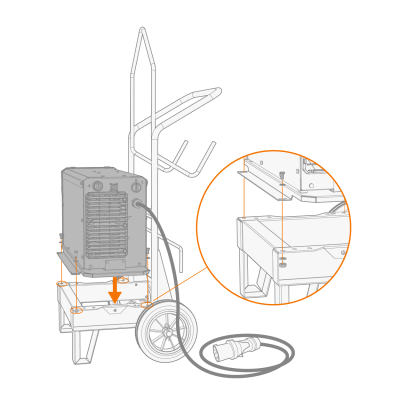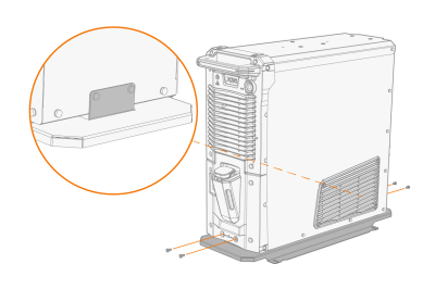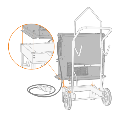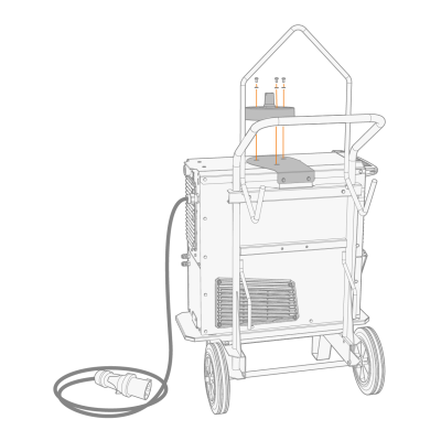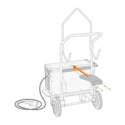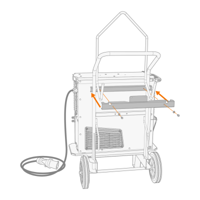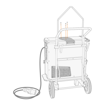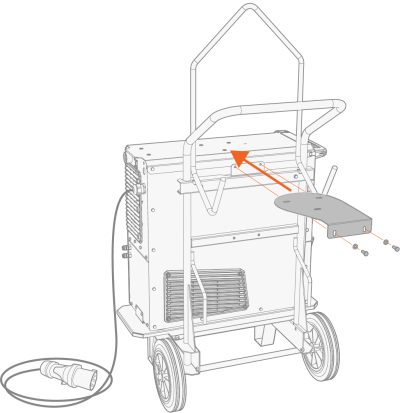 | 3. | 如果安装更高电源型号(带集成水箱):根据设备高度将固定板支架连接到手推车框架上。用随附的螺栓(2 x M6x16螺栓和2 x M6垫圈)将固定板从后部固定到位。 |