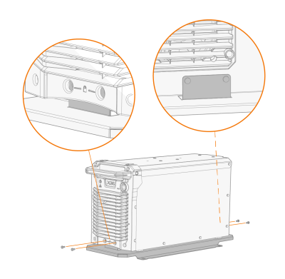 | 1. | 抬起手推车底板上的电源,使固定支架与固定孔对齐。使用提供的螺钉将电源固定到底板上((前面 2 个 M5x12 螺钉,后面 2 个 M5x12 螺钉))。 |