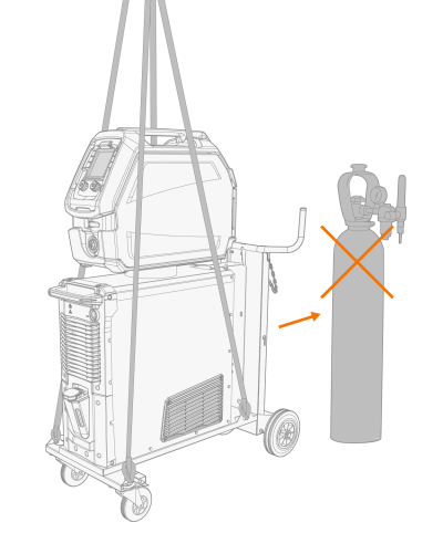 如果您需要提升 X3 FastMig 设备,要特别注意安全措施。还要遵守当地法规。当设备牢固地安装在专用搬运单元(X3T4 推车)上后,只能用机械升降机提升整个 X3 FastMig 设备。