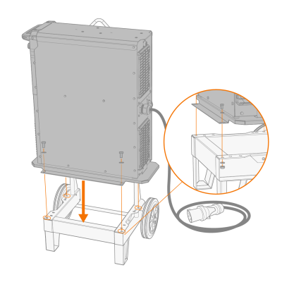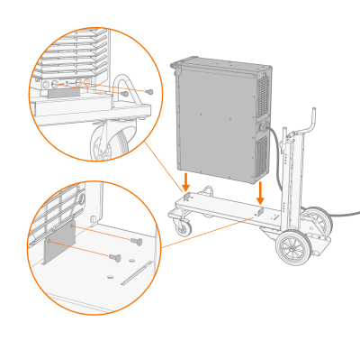 | 3. | Поднимите конструкцию, состоящую из источника питания и нижней пластины, на тележку и закрепите ее через каждый угол нижней пластины. Используйте болты (4 шт. M8x12), гайки (4 шт. M8) и шайбы (8 шт. M8), поставляемые с тележкой. |