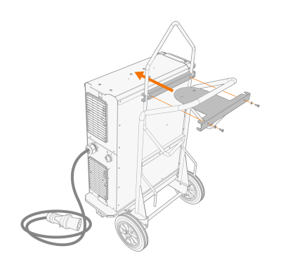 | 2. | Закрепите источник питания на тележке с помощью верхней опорной пластины. Прикрепите пластину к верхней части источника питания и задней части рамы тележки с помощью прилагаемых винтов (2 винта M6x12 с шайбами сверху, 2 винта M8x16 с шайбами сзади). |