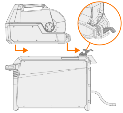 | 4. | 从前向后滑动送丝机,直到背面的横杆锁定到电源的锁定机构中。 |