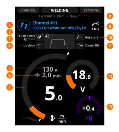 | 1. | Canal de memoria, su número y el programa de soldadura |