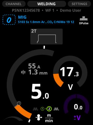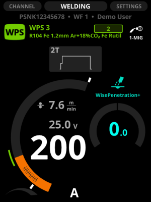 En DPulse, WP Switch y DProcess, puede ajustar dos conjuntos de valores: el primer nivel y el segundo nivel de potencia. Presione el botón verde izquierdo para pasar de uno a otro. Ajuste los valores con las perillas de control. El otro nivel de potencia se indica con una línea gris en el diagrama de la velocidad de alimentación del alambre.