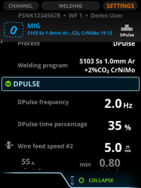 DPulse es un programa de soldadura pulsada con dos niveles de potencia distintos. La potencia de soldadura varía entre estos dos niveles y los parámetros de cada nivel se controlan de forma independiente. En la vista Soldadura, pase del nivel 1 al nivel 2 pulsando el botón izquierdo de Control Pad. El nivel de potencia inactivo se indica con una línea gris en el diagrama de la velocidad de alimentación del alambre.