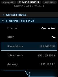 La conexión Ethernet se establece automáticamente cuando conecta el cable Ethernet a la X8 MIG Welder. Los detalles de la conexión Ethernet aparecen en la Configuración de Ethernet cuando se establece la conexión.