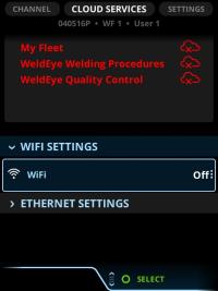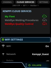 Para emplear los servicios en la nube de Kemppi, conecte la soldadora a Internet mediante una conexión WLAN o por cable. Establezca la conexión mediante el uso de la pantalla de Servicios en la nube en el menú Vista. Allí también podrá ver el estado de los Servicios en la nube.