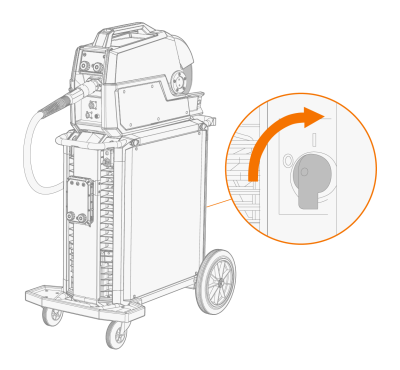 Para encender la fuente de potencia y el alimentador de alambre, encienda el interruptor principal de la fuente de potencia (I). Cuando la fuente de potencia está encendida, el LED indicador de potencia del panel emite una luz verde.