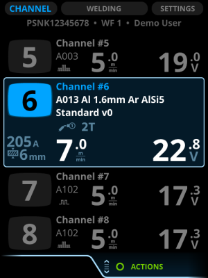 I parametri di saldatura vengono archiviati nei canali di memoria. Il canale di memoria mostra gli stessi dati dei parametri di saldatura riportati nella vista Saldatura. Per utilizzare un canale, selezionarlo. Ogni utente ha i propri canali di memoria.